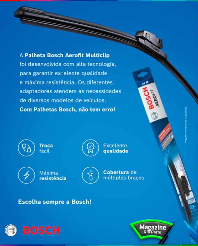 Nova geração de palheta Bosch aerodinâmica, substitui a palheta convencional nos veículos.